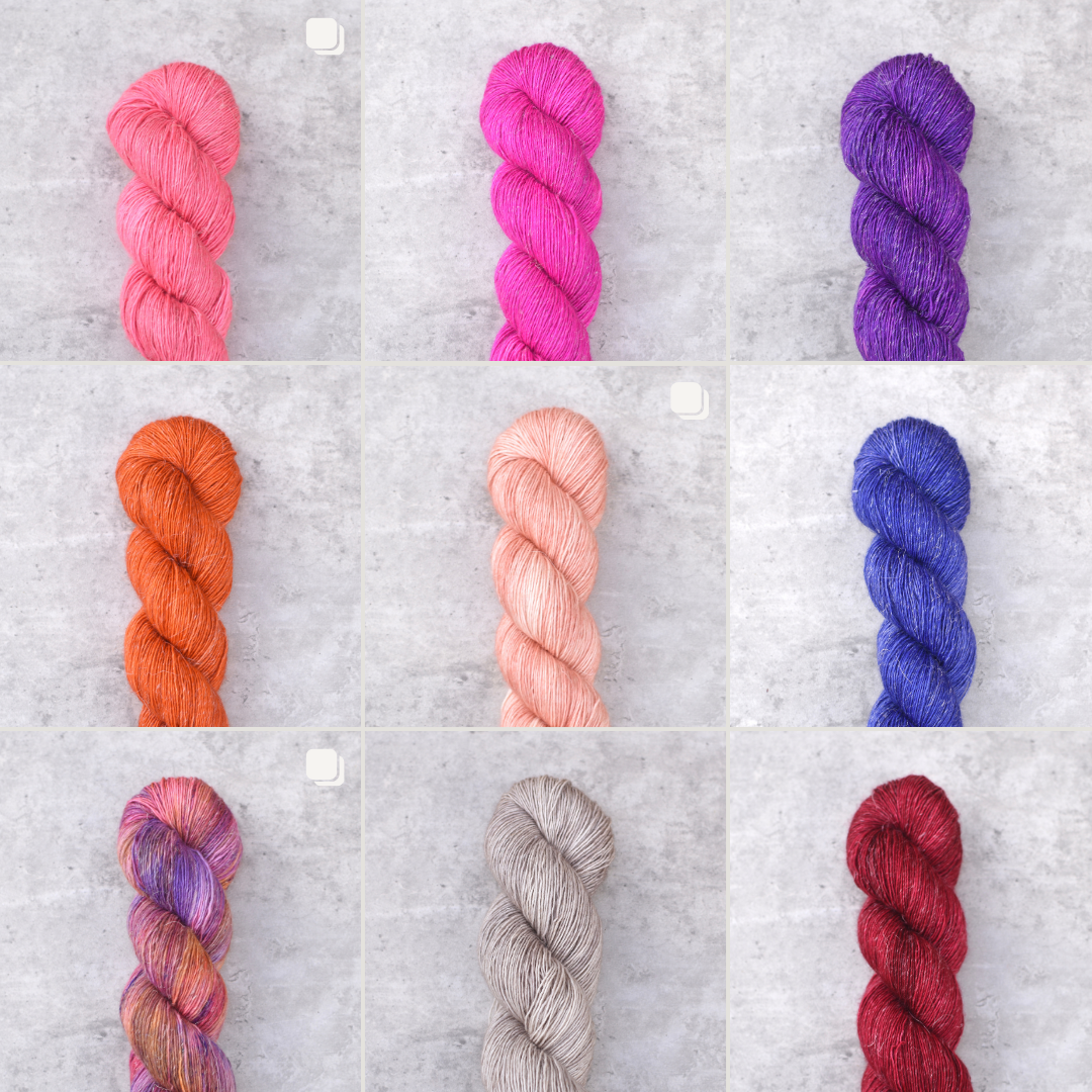 The photo above shows a few of the colors for my new yarn base WooLin. WooLin is a beautiful single ply fingering weight yarn perfect for so many projects, especially lightweight spring/summer garments and accessories. I takes the dye beautifully and allows for deep, rich color saturation.