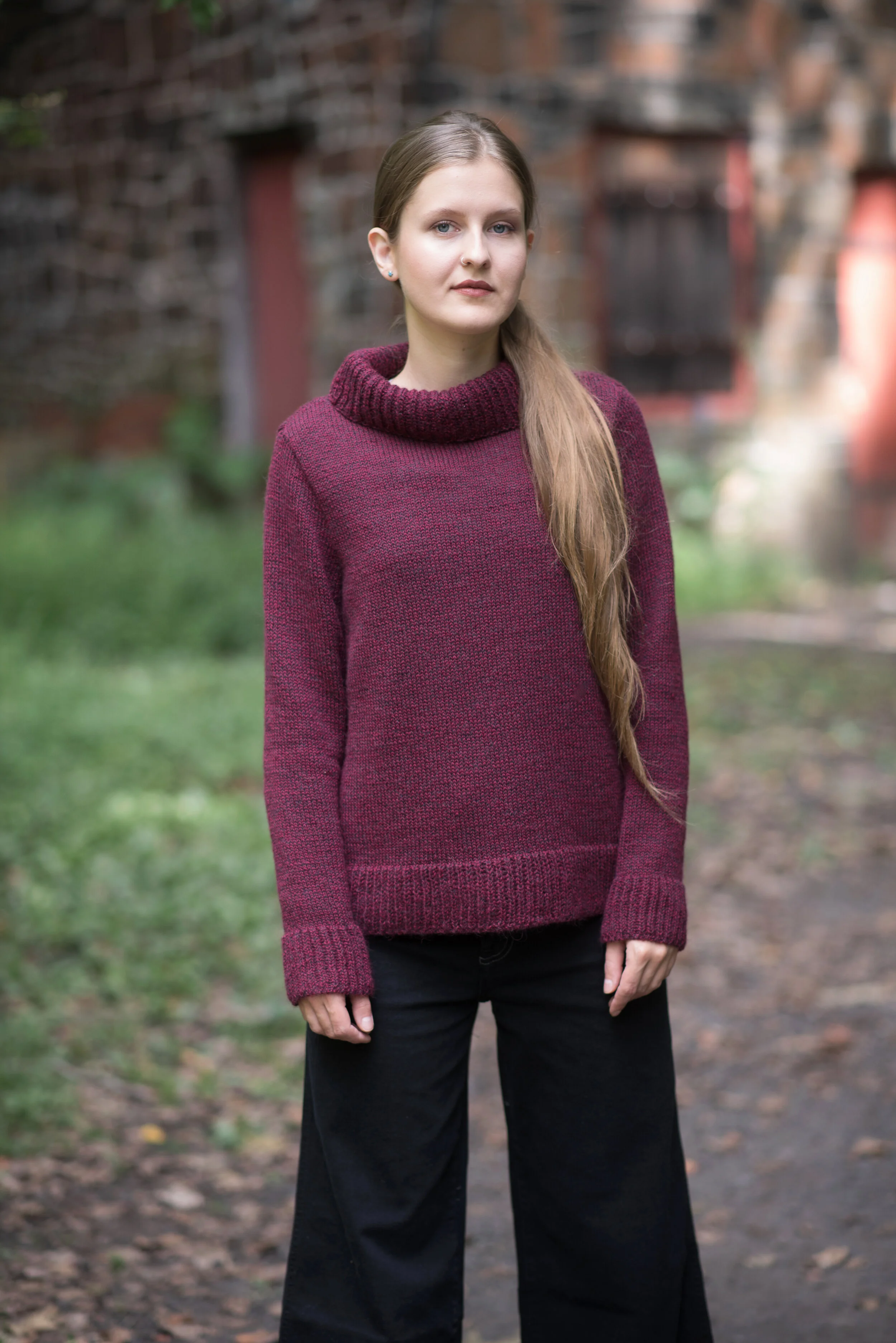 WALLOWA starts with a vented hem worked flat in 2×1 rib between wide Garter Ridge panels at the sides. The body is then knit in the round from the bottom up in Stockinette Stitch, with the Garter Ridge panels at the sides and modified batwing shaping for the sleeves, with dropped shoulders. Work is divided at the underarm and worked flat to the shoulders. Ribbed Sleeves are picked up and worked in the round down to the cuffs. Collar is worked in 1×1 rib.